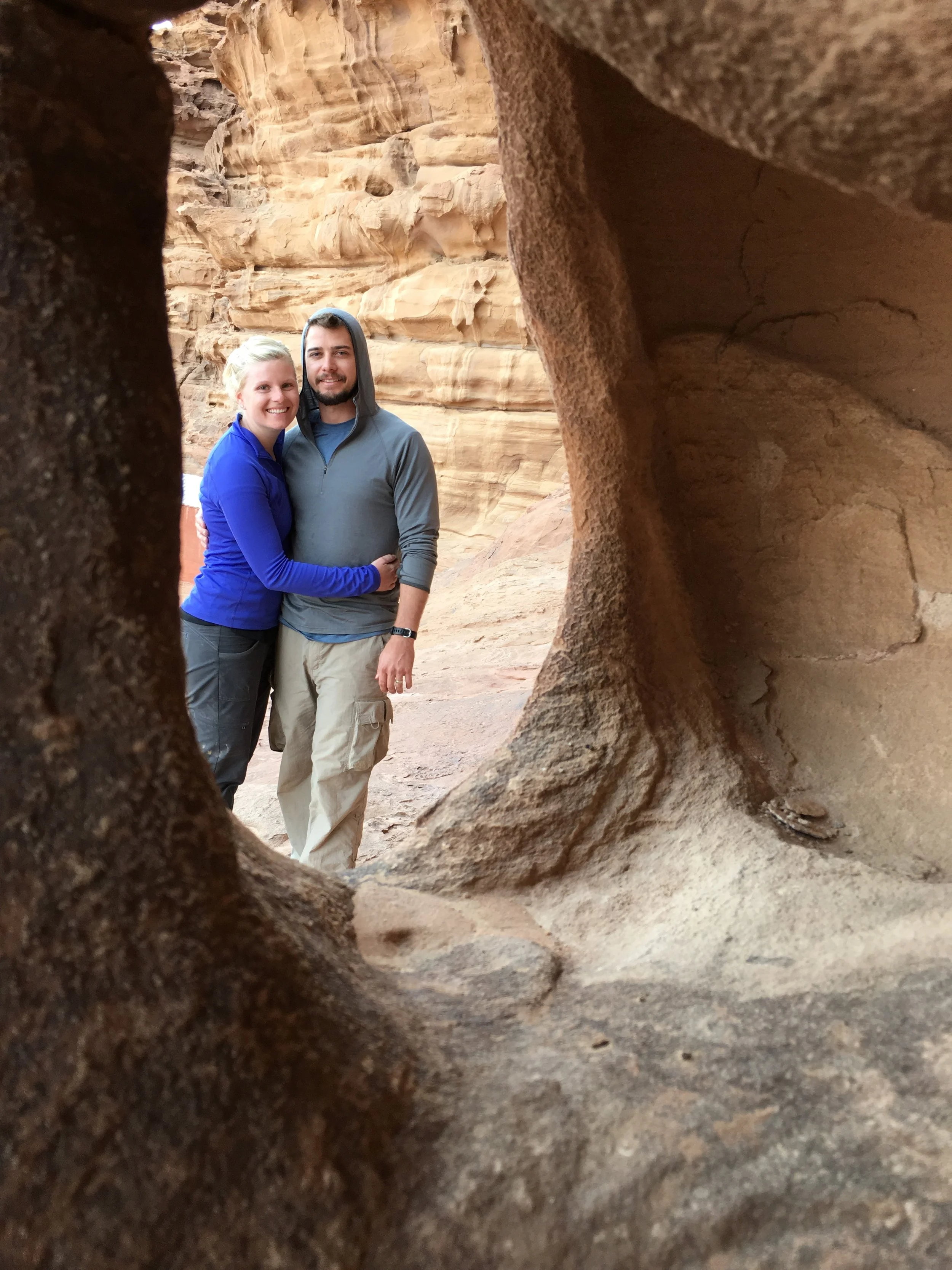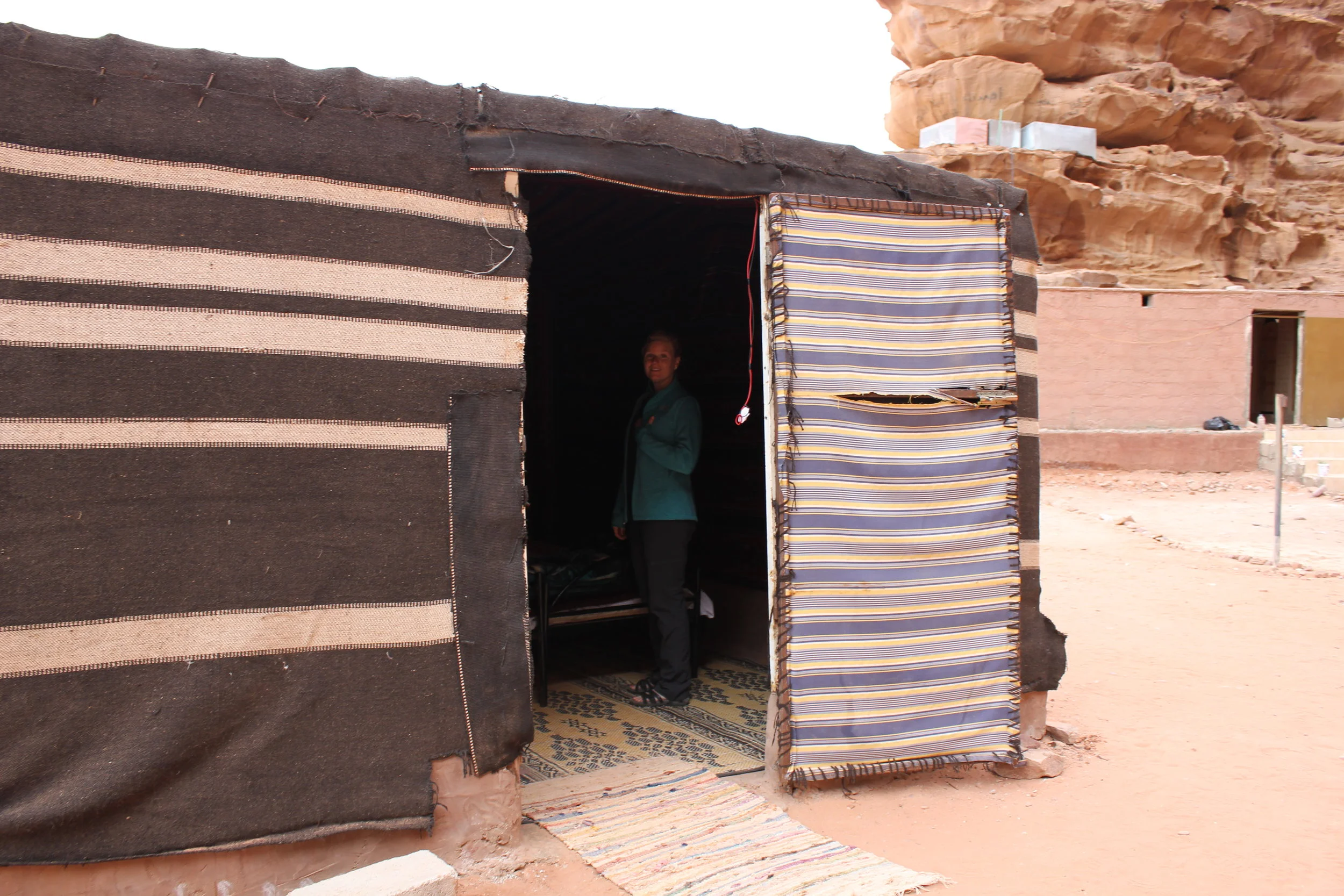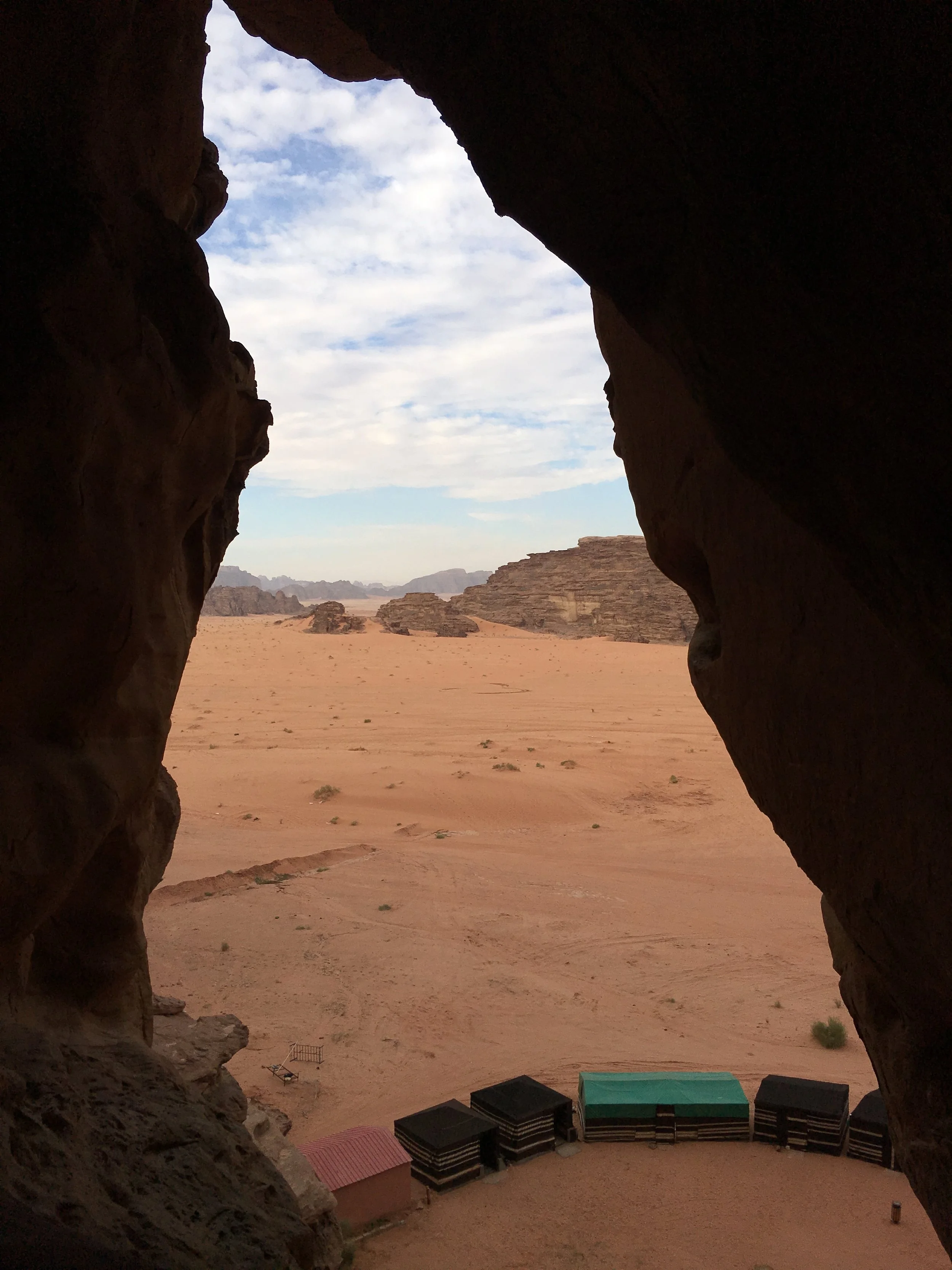 We were greeted by Mohammed, the camp care taker, and tried making conversation while he served us tea. His English was limited, but sufficient enough to make conversation. He got a kick out of us trying to speak some Arabic words and he taught us a few in return. We were the only ones in the camp this early in the day. He asked if we wanted to hike up the big rock formation behind the camp. We told him we did. He had us take our shoes off and we were on our way. We climbed up to a middle point that had an opening into a cave. Mohammed's cell phone started going off in the camp below and he quickly told us to sit down and wait 1 minute while he scrambled down to answer his phone. After about 10 minutes, he came back up to get us and show us the way down.