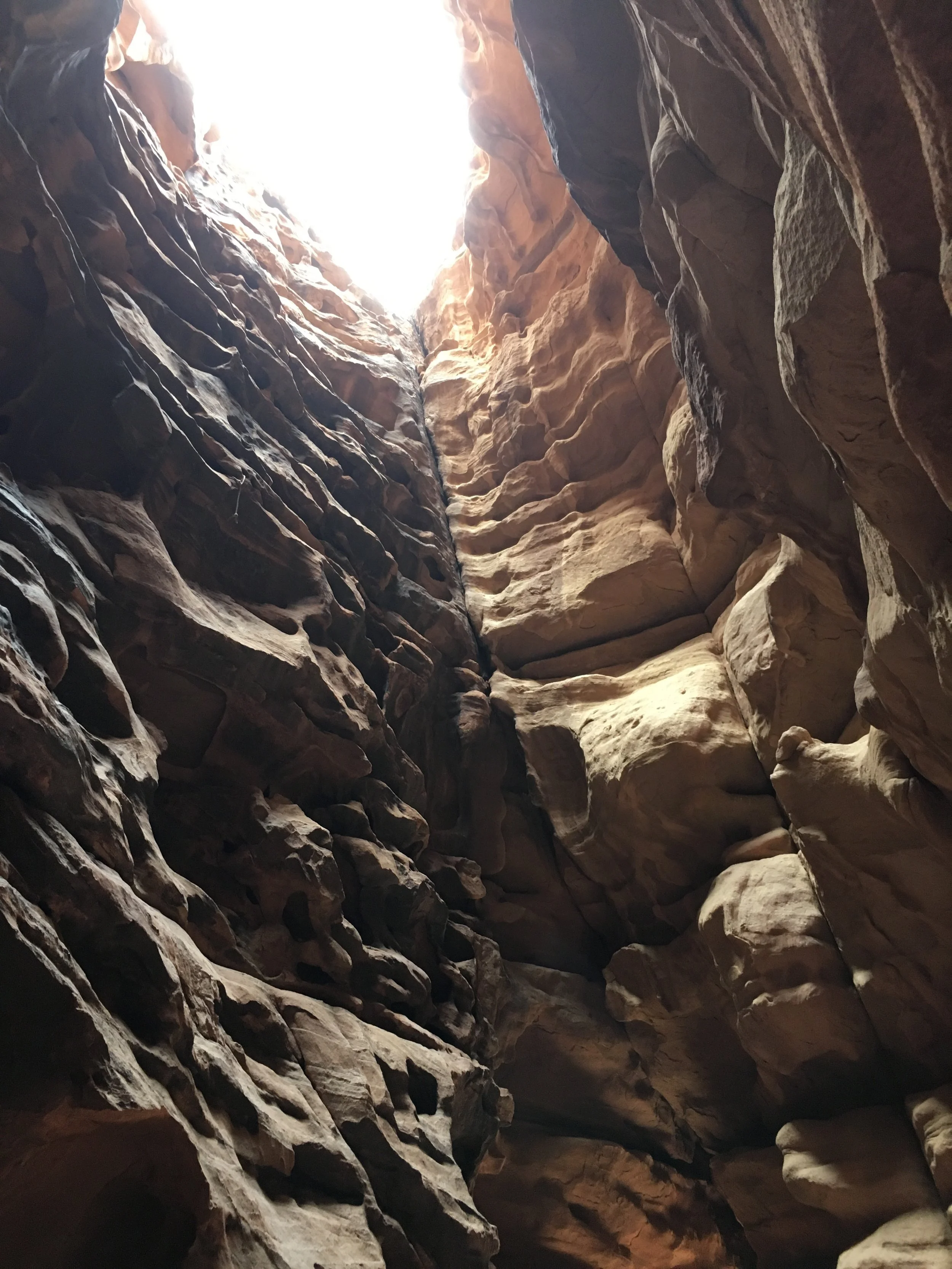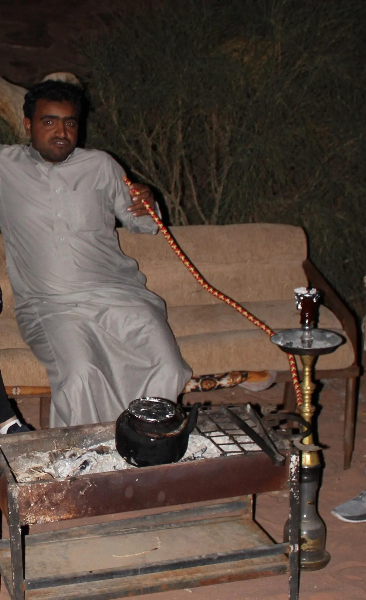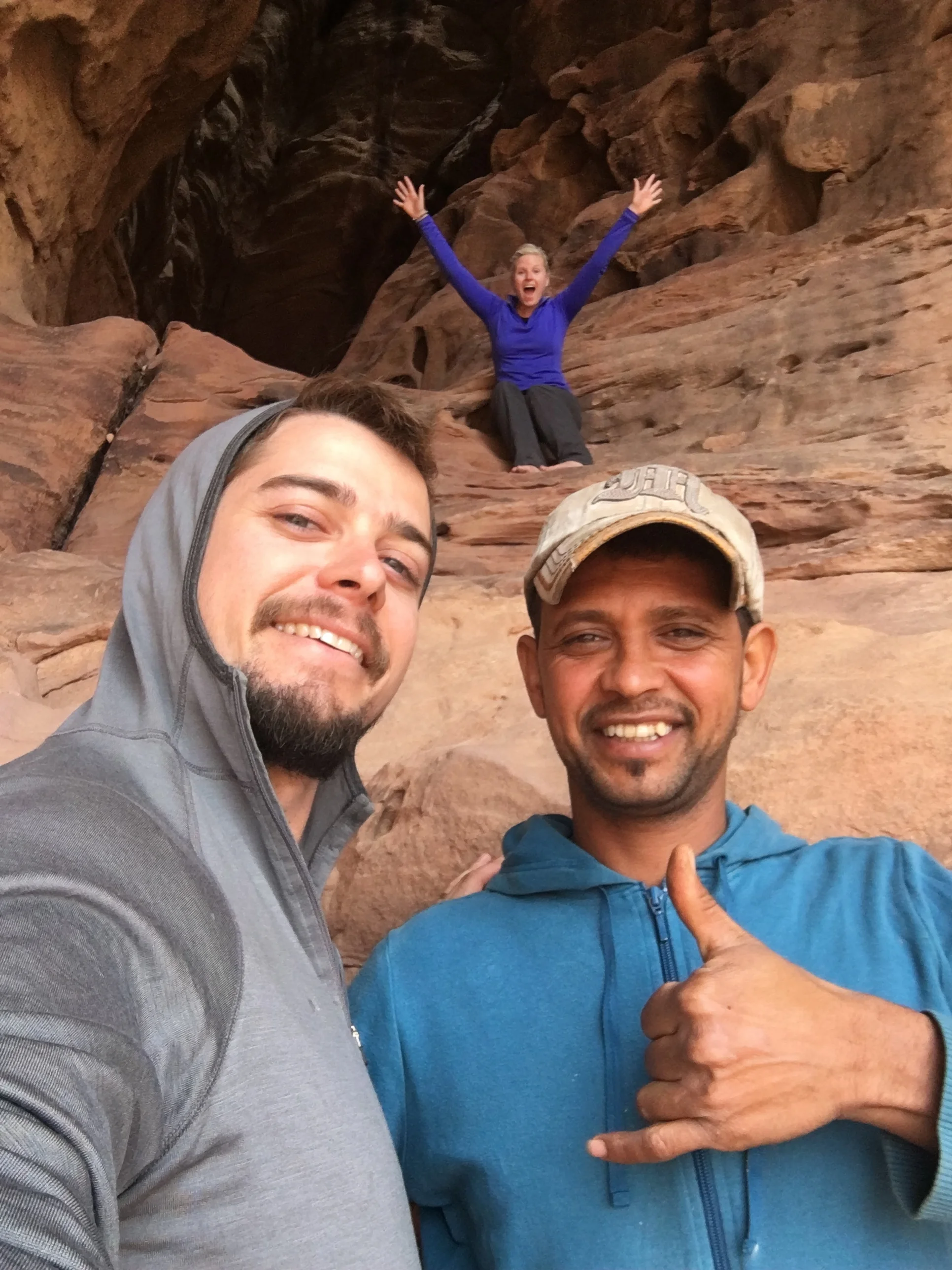 We were greeted by Mohammed, the camp care taker, and tried making conversation while he served us tea. His English was limited, but sufficient enough to make conversation. He got a kick out of us trying to speak some Arabic words and he taught us a few in return. We were the only ones in the camp this early in the day. He asked if we wanted to hike up the big rock formation behind the camp. We told him we did. He had us take our shoes off and we were on our way. We climbed up to a middle point that had an opening into a cave. Mohammed's cell phone started going off in the camp below and he quickly told us to sit down and wait 1 minute while he scrambled down to answer his phone. After about 10 minutes, he came back up to get us and show us the way down.