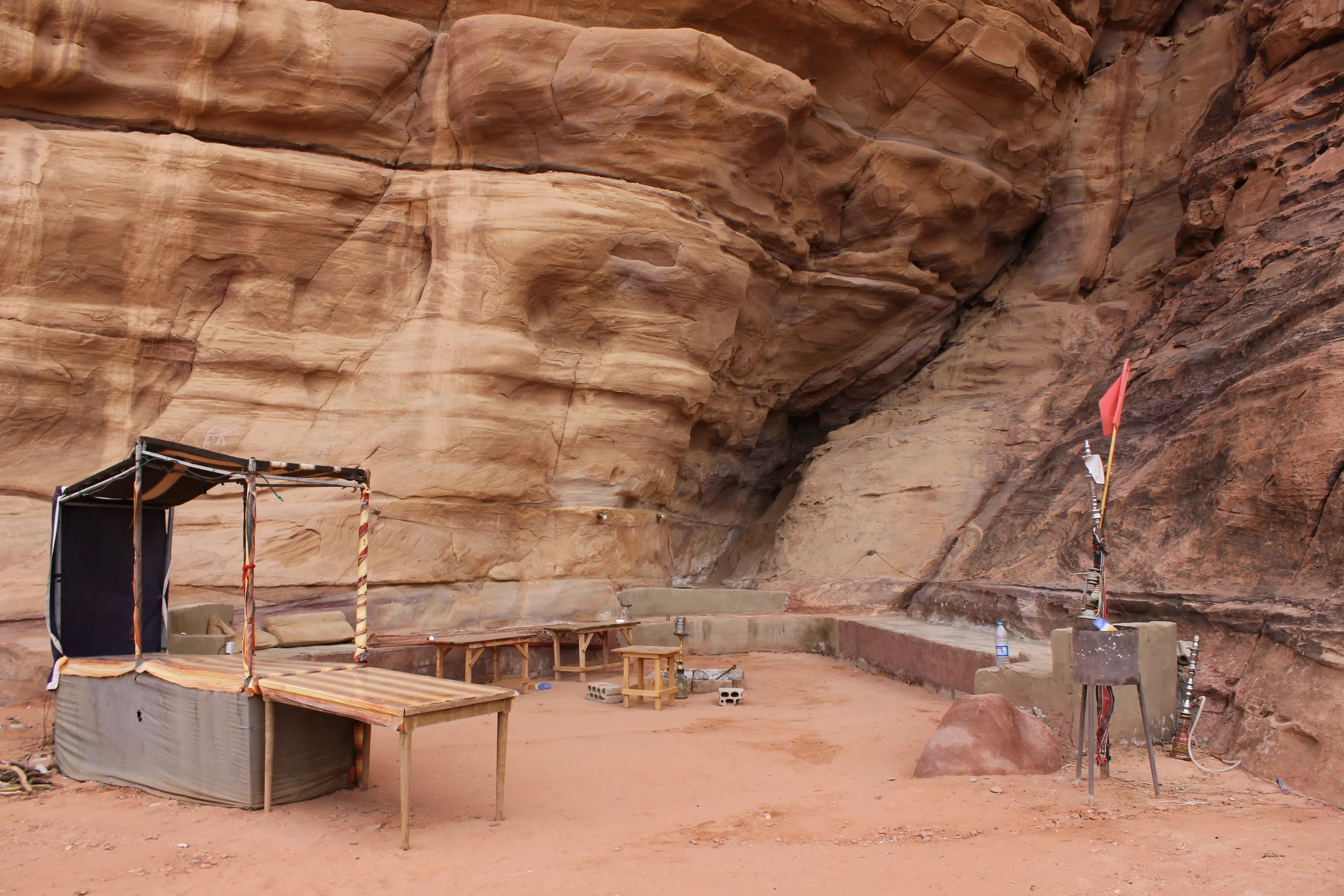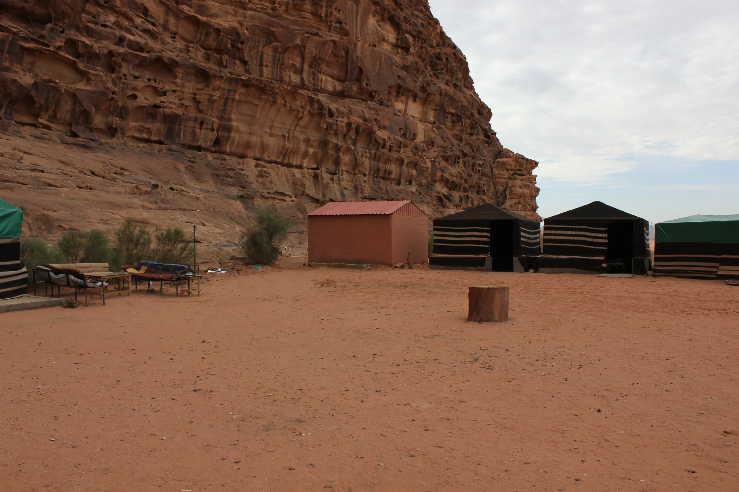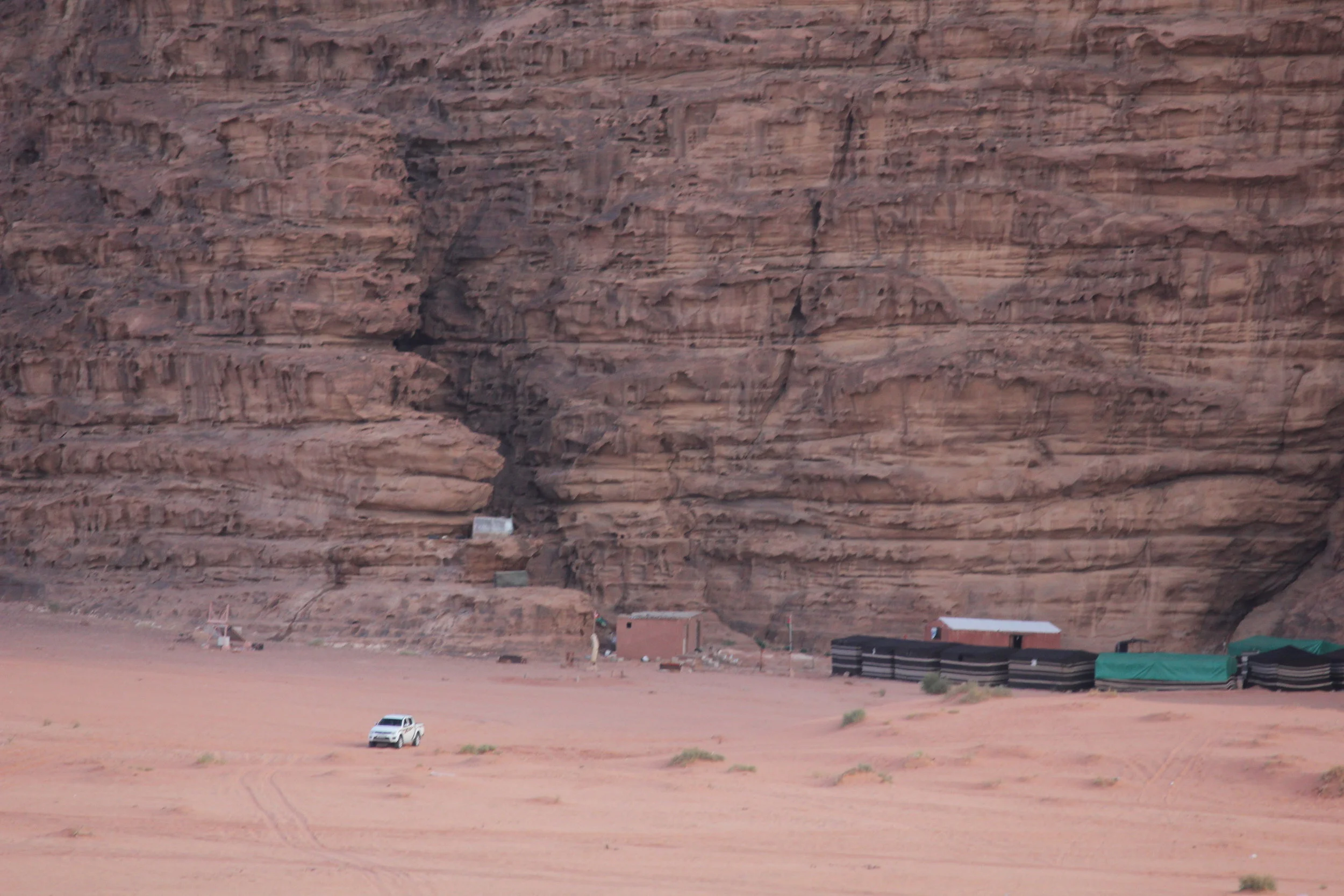 We drove about 7km down the road to the small village of Wadi Rum and parked the car. We set out walking into the desert, intending to have a picnic lunch and enjoy the views before heading back to the visitors center to meet our guide. After about 10 minutes walking, a truck pulled up and told us he was from our camp and that we should go with him. I'm guessing that someone called him and let him know that two of his guests were out wandering on their own. We tried explaining that we just wanted to walk on our own for a bit and he kept mentioning that we should book a jeep tour or we could walk in the desert by our camp. I'm not sure if it was a communication barrier but we eventually gave in, got in the back of his pick up truck and let him drive us to camp.